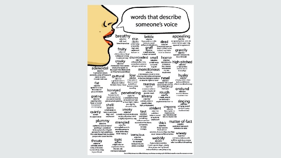VOICE CHARACTER SITUATION Singsong An enthusiastic kindergarten teacher Asking students to pay attention during storytime Rough A skinhead Asking someone for directions at the station Brittle A lady at a checkout Someone has asked her how her day is