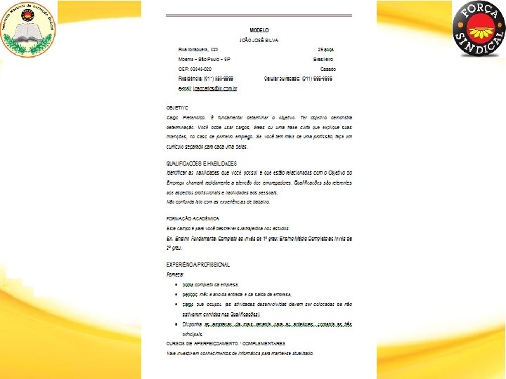 Diretrizes • Fonte: Arial ou Times New Roman • Tamanho da fonte: 12 • O título de cada item pode ser em letras MAIÚSCULAS e em negrito • E-mail: evite colocar endereço eletrônico impróprio, como por exemplo: gatinhamanhosa@hotmail. com ou garanhão@ig. com. br • NÃO escrever “Currículo” ou “Currículum Vitae” • NÃO colocar foto no currículo, a menos que seja solicitado