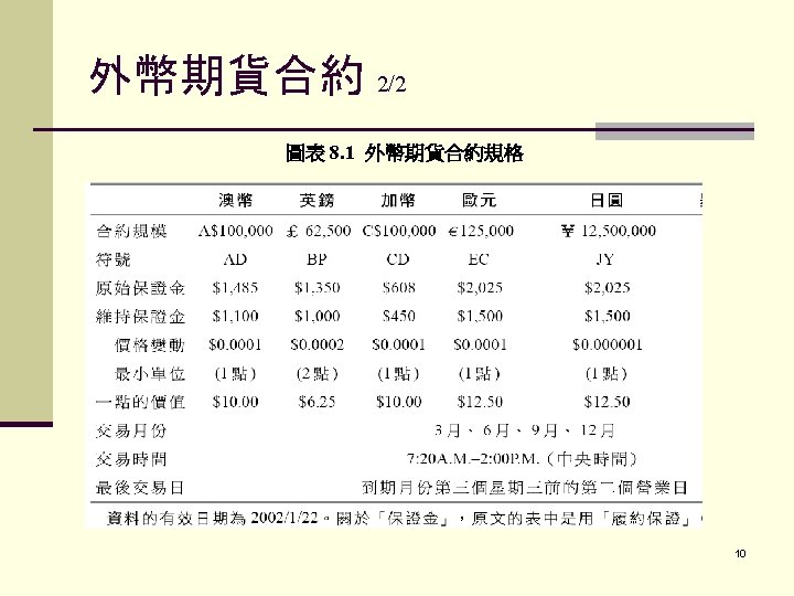 FUTURES CONTRACTS b. Available Futures Currencies/Contract Size: 1. ) British pound / 62, 500 2. ) 3. ) 4. ) 5. ) 6. ) 7. ) Canadian dollar /100, 000 Euro / 125, 000 Swiss franc / 125, 000 Japanese yen / 12. 5 million Mexican peso / 500, 000 Australian dollar / 100, 000 5