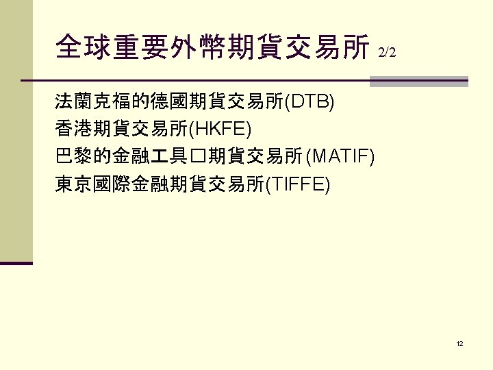 FUTURES CONTRACTS g. Global futures exchanges: 1. ) 2. ) 3. ) 4. ) 5. ) 6. ) I. M. M. International Monetary Market L. I. F. F. E. London International Financial Futures Exchange C. B. O. T. Chicago Board of Trade S. I. M. E. X. Singapore International Monetary Exchange D. T. B. Deutsche Termin Bourse H. K. F. E. Hong Kong Futures Exchange 8