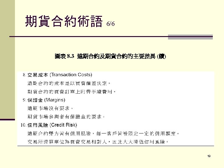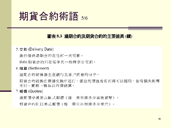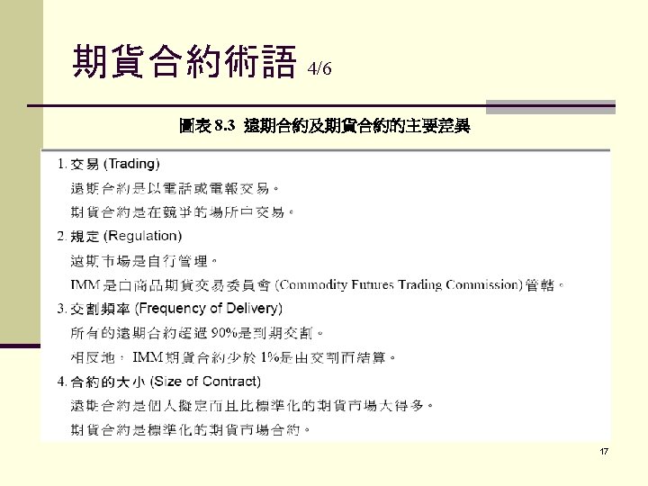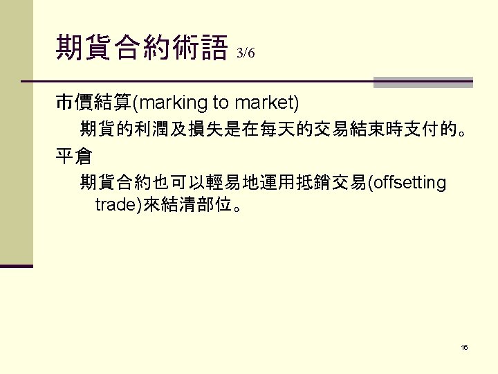 期貨合約術語 1/6 保證金(現在CME稱之為「履約保證」(performance bond)), 原始保證金(performance bond,以前稱之為initial margin)是指要從事交易時帳戶餘額上所需具備的 金額 維持保證金(maintenance performance bond,以前 稱之為maintenance margin) 追繳保證金(performance bond call,以前稱之為 margin call) 15