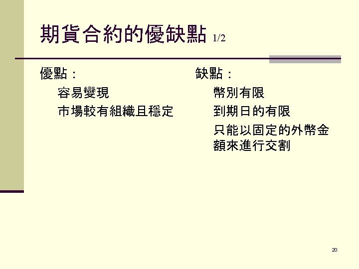 FUTURES CONTRACTS Advantages of futures: 1. ) Easy liquidation 2. ) Well- organized and stable market. Disadvantages of futures: 1. ) Limited to 7 currencies 2. ) Limited dates of delivery 3. ) Rigid contract sizes. 14