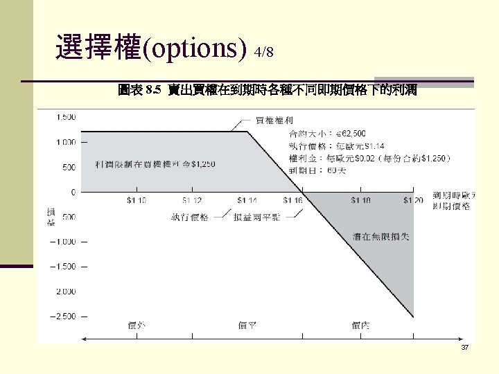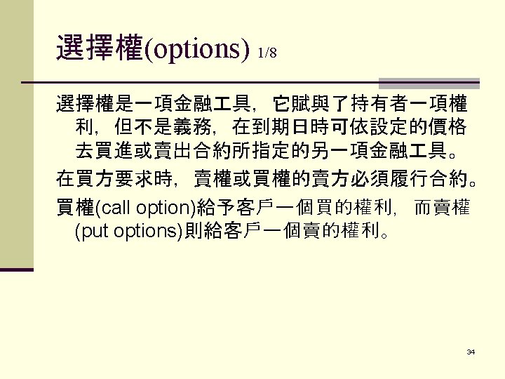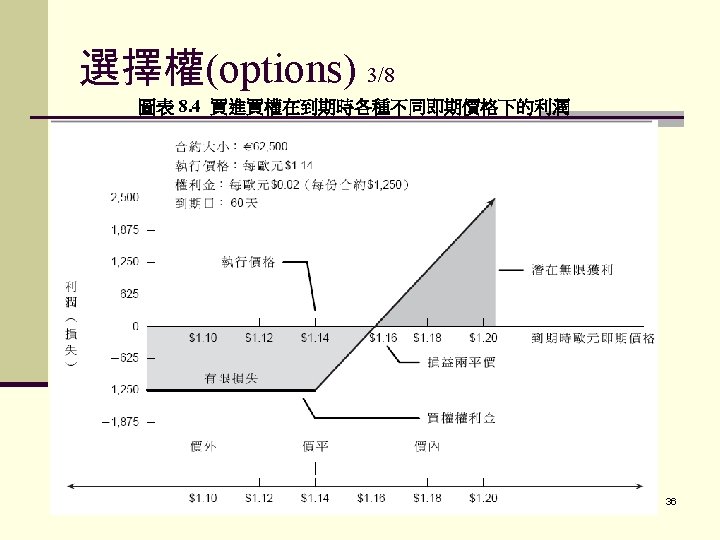 Options Sample Problems Ford buys a French put option (contract size: FF 250, 000) at a premium of $. 01/FF. If the exercise price is $. 21 and the spot at expiration is $. 216, what is Ford’s profit (loss)? 33