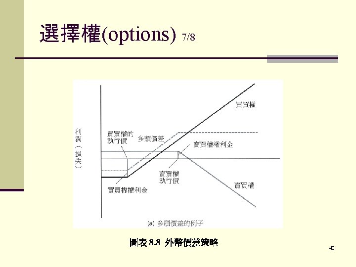 CURRENCY OPTIONS 9. What is the premium? - The price of an option that the writer charges the buyer. B. Why Use Currency Options? 1. For the firm hedging foreign exchange risk with Future event is very uncertain gains. 30