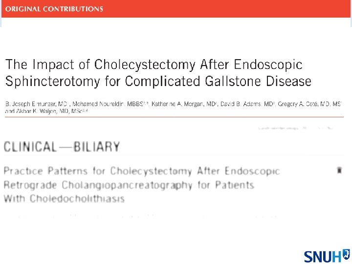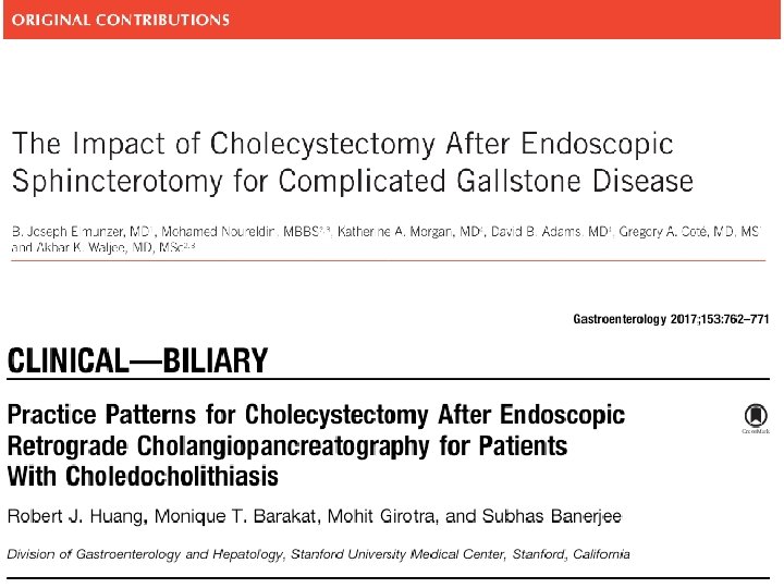 Results ES alone 39. 3% vs ES+CCY 18. 0% in recurrent complication 16% of ES only group underwent subsequent CCY B. Joseph Elmunzer et al. Am J Gastroenterol 2017 112, 1596– 1602
