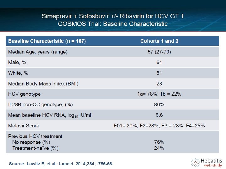 COSMOS Study Design Randomized 2: 1: 2: 1 Arm 1 SMV+SOF+RBV Post-treatment follow-up Arm 2 SMV+SOF Post-treatment follow-up Arm 3 SMV+SOF + RBV Post-treatment follow-up Arm 4 SMV+SOF Post-treatment follow-up 12 24 36 Cohort 1 – Metavir F 0 -F 2, prior null responders Cohort 2 – Metavir F 3 -F 4, prior null responders or naives Primary Endpoint: SVR 12 (sustained viral response, no hcv 12 weeks after the end of treatment) Secondary Endpoints: RVR, Tx failure, relapse rate, safety Lawitz, etal. 49 th EASL, April 9 -13, 2014; Lancet, 2014. 48 20
