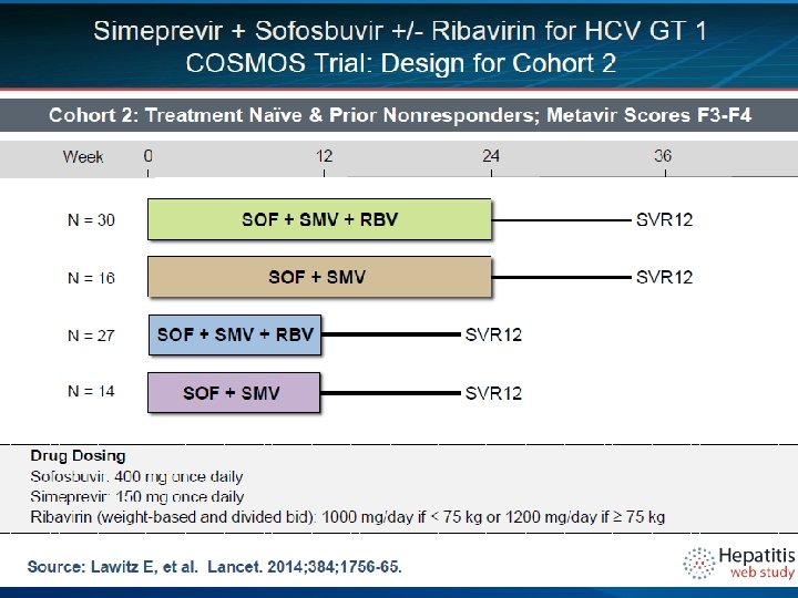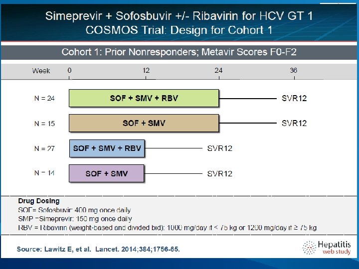 Standard Dosing § § Sofosbuvir – 400 mg once daily Simeprevir – 150 mg once daily Peg Interferon – 180 mcg once weekly Ribavirin – weight based dosing § <75 kg – 1000 mg daily in divided doses § ≥ 75 kg – 1200 mg daily in divided doses www. hcvguidelines. org