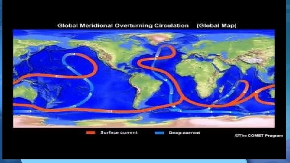 How surface currents and deep currents interact • Surface currents carry warm water to polar regions. • Warm water replaces cold water that sinks to the ocean floor. • Deep currents carry cold water along the ocean floor from polar regions. • Water from deep currents rises to replace water leaving surface currents.