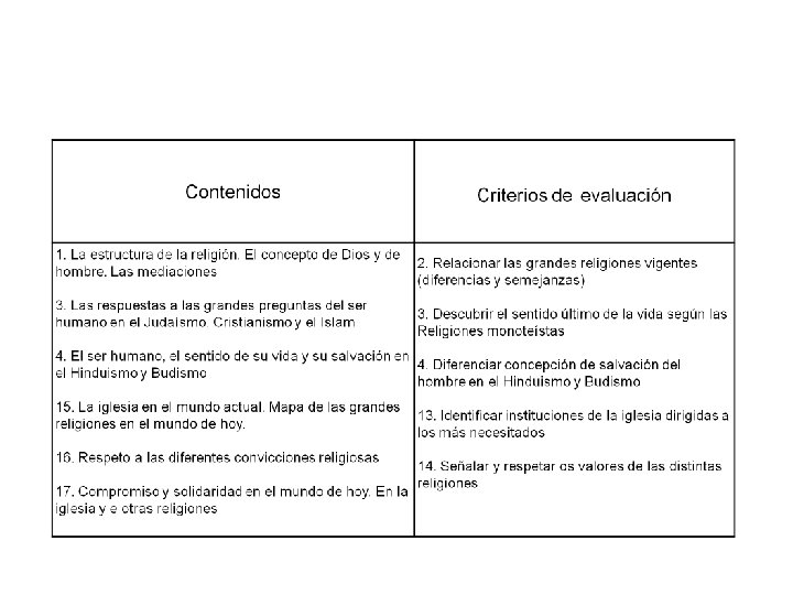 Criterios de evaluación • Distinguir a los fundadores de las religiones monoteístas, comparándolos entre si en los aspectos concernientes a su relación con Dios y su compromiso con el hombre • A través de los personajes bíblicos, verificar la acción salvadora de Dios y su plenitud en Jesucristo • Reconocer el amor de Dios al crearnos a su imagen y adoptarnos como hijos • Distinguir y relacionar los sacramentos de la iniciación, la reconciliación y la Eucaristía • Saber describir a la Iglesia como Cuerpo de Cristo • Explicar el significado de algunos textos evangélicos que hagan referencia a la vida eterna