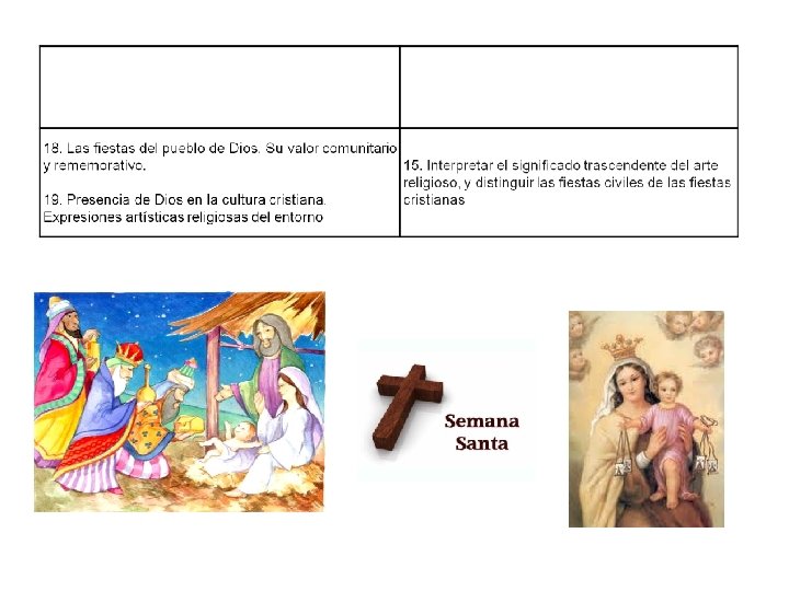 • Competencia social y cívica Ø la enseñanza religiosa católica educa la dimensión moral y social de la personalidad del alumno Ø El testimonio de hombres y mujeres santos en toda la historia constituye un referente continuo para la asimilación de los valores más genuinamente cristianos • Competencia cultural y artística Ø Conocimiento y valoración de toda expresión artística, histórica, simbólica y modos de vida impregnados de cristianismo como manifestación del hecho religioso. Ø Conservación y valoración del patrimonio cultural Ø Elementos que definen las demás grandes religiones
