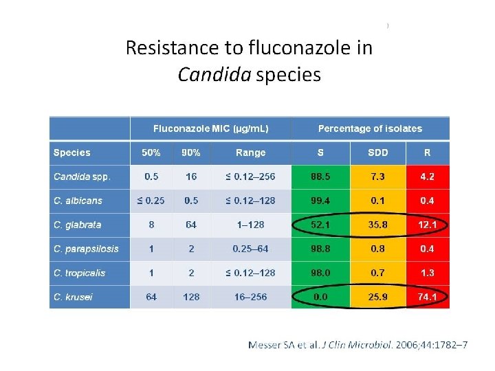 In vitro sensitivity of Candida species Species Fluconazole Itraconazole Posaconazole Voriconazole Ampho B Echinocandins S S S S S (to I? ) S to S-DD S S S-DD to R S to I S C. krusei R S-DD to R S to I S C. lusitaniae S S S to R S C. albicans C. tropicalis C. parapsilosis C. dubliniensis C. glabrata S = sensitive I = intermediate R = resistant S-DD = sensitive dose-dependent