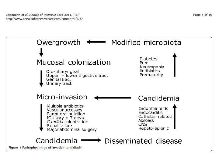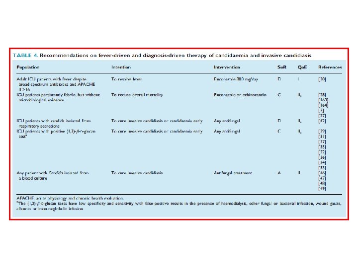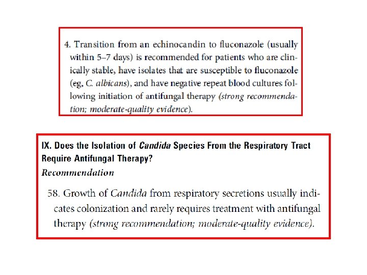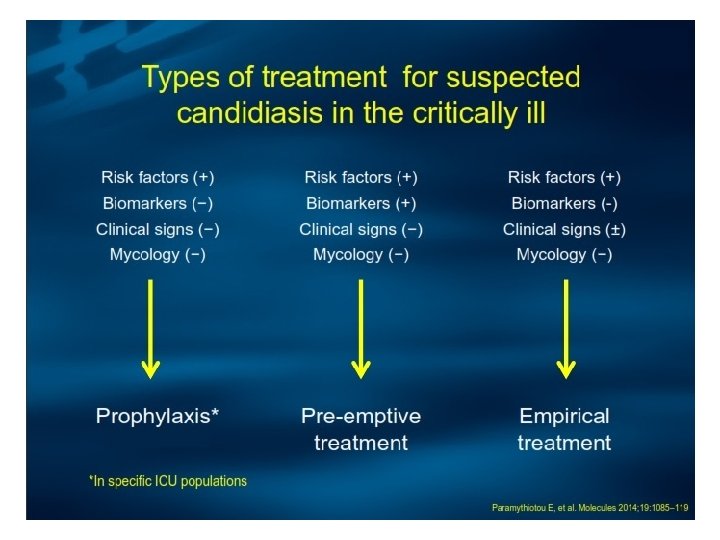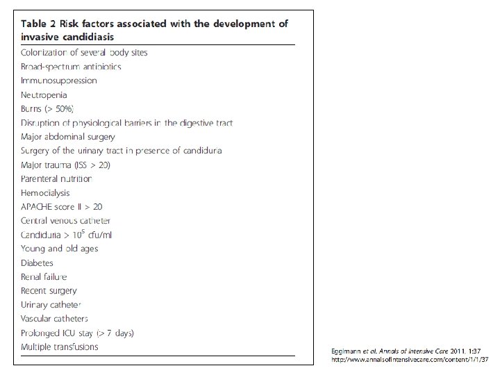 Identified High Risk of Candida Critically Ill patients Colonization Index -n○ sites (+)/n○ screened 2 x weekly > 0. 5 or 0. 4 corrected Candida score • surgery on ICU admission • total parenteran nutrition • multifocal colonisation • severe sepsis - Cut off value 2. 5 Prediction rule 1 1 1 2 • > 4 th days of ICU stay Sepsis + CVC + Mech Vent + one of the following - TPN -mayor surgery - dialysis -pancreatitis - immunosuppresive agent or steroid Start empirical antifungal treatment Patients treated : 10 -15% Candidiasis captured : 85 -90% Patients treated : 15 -20% Candidiasis captured : 75 -85% Patients treated : 10 -15% Candidiasis captured : 60 -75% Eggimann Ann Intensive Care 2011