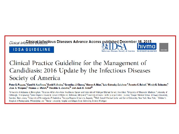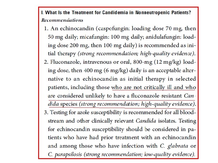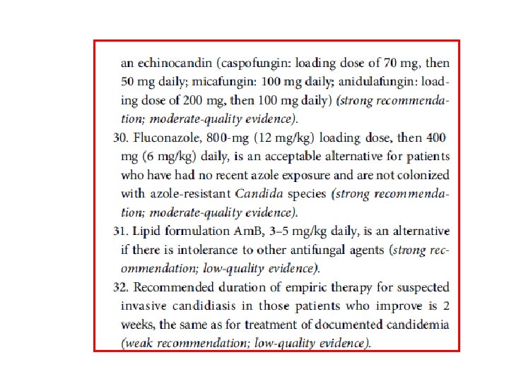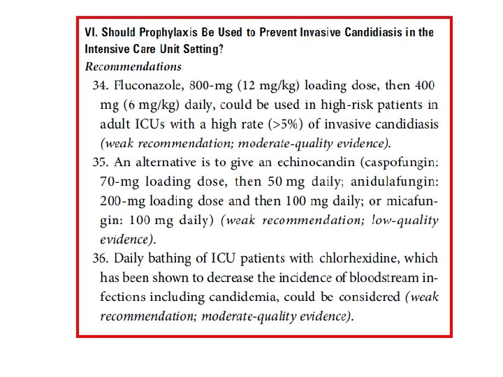 Risk Factors for Invasive Candida • • Candida colonization Severity of illness Exposures to broadspectrum antibiotics Recent major surgery, particularly abdominal surgery Necrotizing pancreatitis Dialysis Parenteral nutrition Corticosteroids • The use of CVC IDSA GUIDELINE 2016