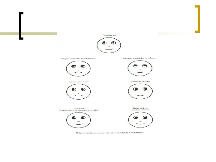 Definicions II n Calibrado: n Calibrar es descubrir los indicadores de comportamiento asociados a un estado interno con el fin de hacer predicciones, mejorar la conexión y confianza, etc… ¡ Un calibrado realizado con exactitud permite descartar en gran medida las interpretaciones erróneas, y con ello insistir en la minuciosidad de la observación de las distintas formas de expresión del individuo que evita que generalicemos ( nos comportamos en función de lo que pensamos y sentimos de forma consciente o inconsciente, ya que todo comportamiento supone una actividad neurológica, igual que si no hay actividad neurológica no existe comportamiento). n Claves de acceso ocular: n Cuando procesamos información de forma interna, podemos hacerlo de forma visual, auditiva, kinestésica, olfativa o gustativa. Es posible acceder al significado de una palabra, en cualquiera de ellos, o en combinación de los cinco canales. Mediante la observación de los patrones y movimientos oculares podemos obtener claves acerca de donde almacena esa información la persona y como actuara probablemente.