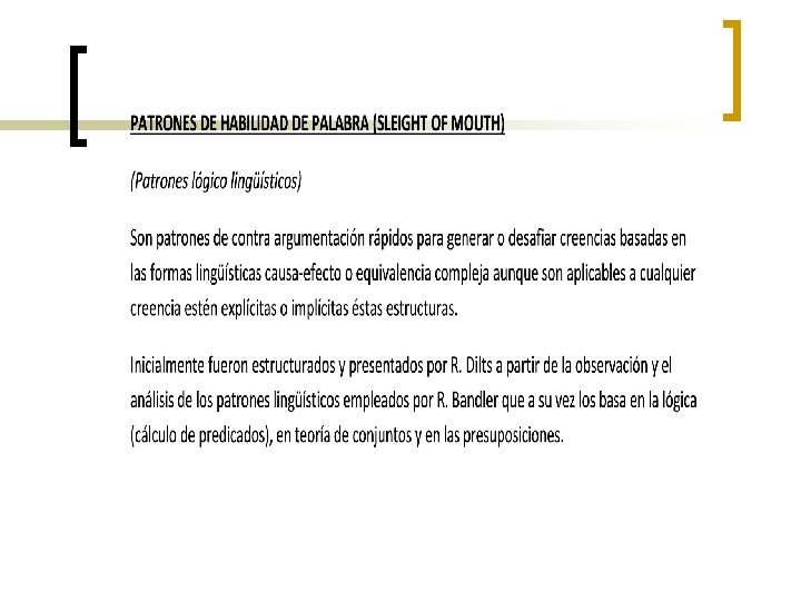 2 - Patrones de Habilidad de palabra n Niveles NL de Robert Dilts n Sligth of mouth ( prestidigitación de palabra) ¡ Contraejemplos ¡ Difuso ¡ Revertir la presuposición ¡ Aplicate el cuento ¡ Redefinir ¡ Intención y nueva conclusión ¡ Jerarquía de criterios ¡ Cambiar el índice referencial ¡ Cambiar el tamaño del encuadre