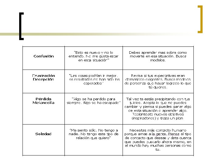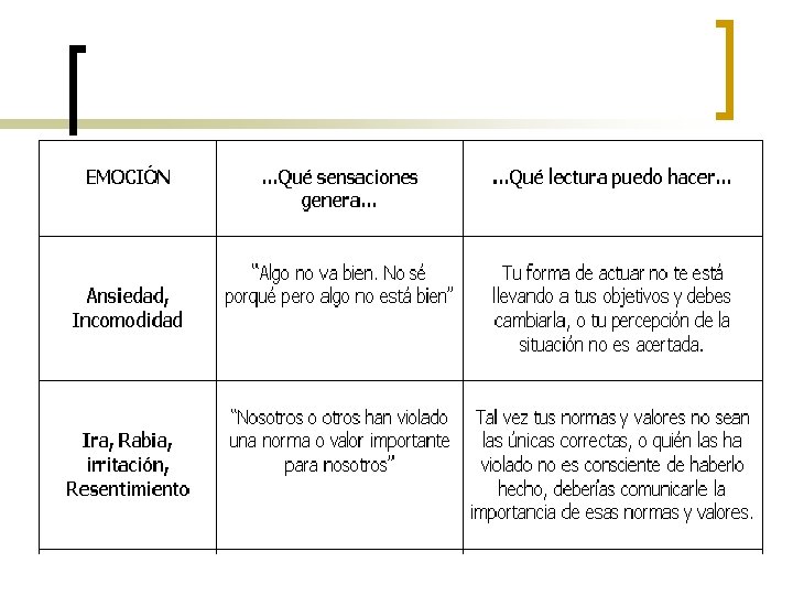 CONCIÈNCIA EMOCIONAL Definiremos la conciencia emocional como la capacidad de n reconocer las emociones propias y sus efectos. Las personas dotadas de esta aptitud: n ¡ Saben qué emociones experimentan y para que. ¡ Perciben los vínculos entre sus sentimientos y lo que piensan, hacen y dicen. ¡ Reconocen qué efecto tienen estas sensaciones sobre su eficacia. ¡ Conocen sus valores y metas y se guían por ellos