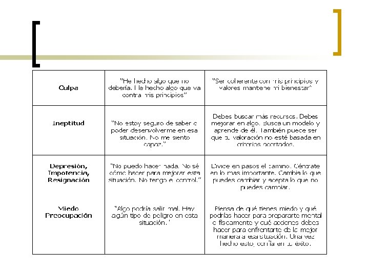 SIGUES PERFECTE SIGNIFICAT És possible fer les coses de manera perfecta COMPORTAMENT La persona viu amb l’ansietat de no oblidar res, torna a començar les coses moltes vegades, està tens, busca controlar tot el que passa. És molt exigent amb ell mateix i amb els altres CREENÇA ERRÒNIA Un ser humà pot fer les coses a la perfecció. VALOR OK Eficiència EFECTE PERVERS Estrès motivat per la rigidesa i el perfeccionisme. El intent de fer les coses a la perfecció porta a que no puguis acabar les coses