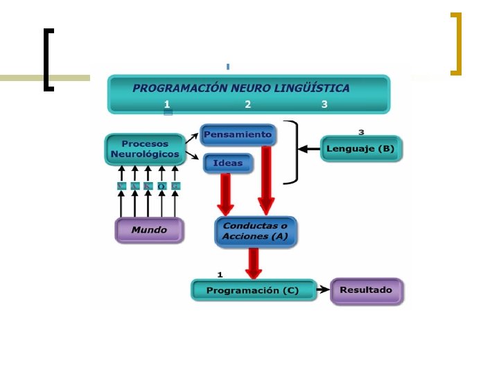 Estudi de l’estructura de l’experiència subjectiva humana ( estudi de l’espiritualitat) La PNL desarrolló instrumentos y distinciones con los cuales identifica y describe patrones verbales y no verbales de personas. O sea aspectos clave de lo que las personas hablan, hacen (o no hablan, no hacen). Los objetivos básicos de la PNL son modelar habilidades especiales o excepcionales, el propósito de este tipo de modelado es colocar lo que fue descrito y observado en acción de una manera que sea productiva y enriquecedora. Este término PNL (NLP), se refiere a tres aspectos básicos de la experiencia humana. 1. El sistema nervioso (N): es nuestra neurología. Esta es una de las maravillas de este Universo. Es increíble lo que podemos llegar a realizar por medio de nuestro SN. Nuestra capacidad de estar consciente, estar atentos, oír y sentir el mundo a nuestro alrededor y dirigirnos internamente y a nuestro medio de manera sorprendente. El SNH es fuente de la cultura, ciencia, religión, arte, medicina y todas las otras habilidades que nos vuelven únicos y poderosos. 30