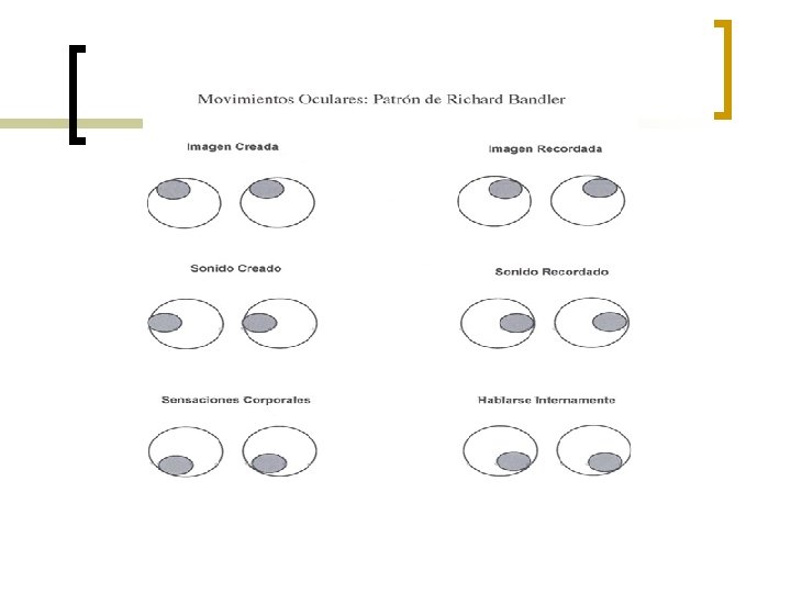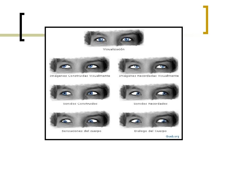 Claves de acceso ocular n n n n Acceder a las RI a través de las claves de acceso ocular Procesamiento de la información de forma V, A, K, O, G Los mitos de las clave de acceso ocular Buscar un patrón, no os quedéis con la norma para acceder cómo guarda la información de recursos o imaginaciones (construido) Calibrar varias respuestas Identificar si está asociado o disociado Es un patrón de procesamiento de los inicios dela PNL donde aún no se habían descubierto las sub modalidades