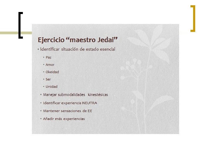 Agudeza sensorial y Calibrado n n Tipos de calibrado ¡ Visual ¡ Auditivo ¡ Kinestésico EJERCICIO DE CALIBRADO AUDITIVO ¡ Ponerse uno frente a otro y asociarse a experiencia+/- y contar del 1 al 10 ¡ Adivinar y cambiar cuando aciertes tres veces EJERCICIO DE CALIBRADO VISUAL ¡ Asociarse a experiencia +/- y dejar que el otro tome la foto ¡ Asociarse a una de las dos y adivinar EJERCICIO DE CALIBRADO CINESTESICO ¡ Asociarse a experiencia + / - y poner las manos una encima de la otra ¡ Experimentar cambios de vibración, temperatura y adivinar