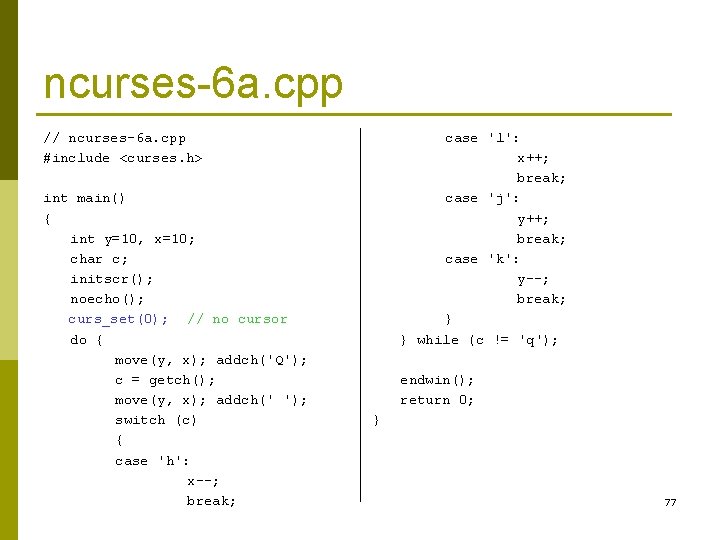 ncurses-6 a. cpp // ncurses-6 a. cpp #include <curses. h> int main() { int y=10, x=10; char c; initscr(); noecho(); curs_set(0); // no cursor do { move(y, x); addch('Q'); c = getch(); move(y, x); addch(' '); switch (c) { case 'h': x--; break; case 'l': x++; break; case 'j': y++; break; case 'k': y--; break; } } while (c != 'q'); endwin(); return 0; } 77