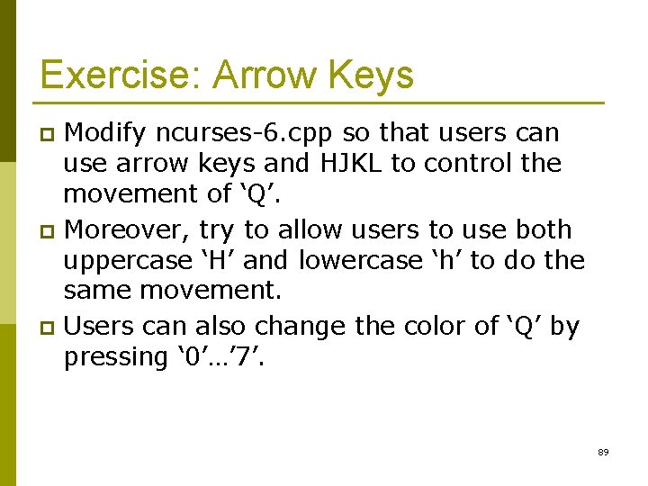 Exercise: Arrow Keys Modify ncurses-6. cpp so that users can use arrow keys and HJKL to control the movement of ‘Q’. p Moreover, try to allow users to use both uppercase ‘H’ and lowercase ‘h’ to do the same movement. p Users can also change the color of ‘Q’ by pressing ‘ 0’…’ 7’. p 89