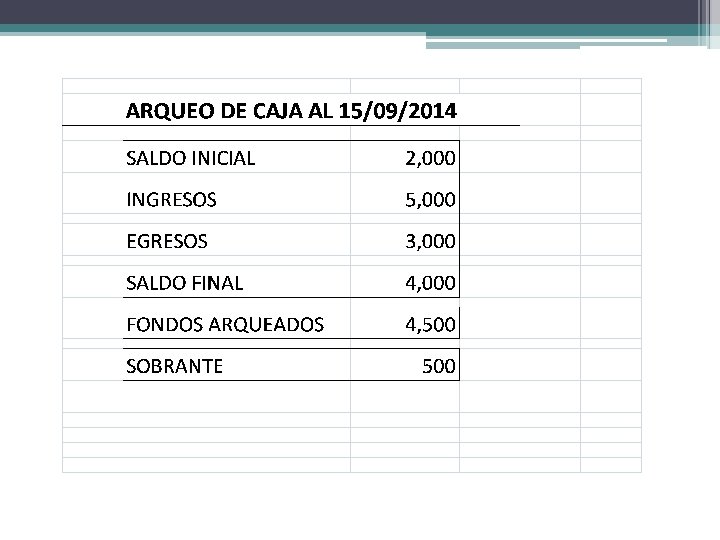 Durante el transcurso de la jornada se suceden ingresos y egresos en la caja de una empresa, los cuales deben de irse anotando en una planilla de caja. Al cierre de cada día, es necesario un control de los fondos existentes, comparándolos con lo que la planilla de caja dice debería haber. Las diferencias pueden ser: SOBRANTE DE CAJA ó FALTANTE DE CAJA. Los mismos deben rastrearse para identificar de dónde surgen.
