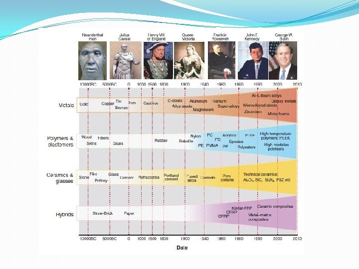 Evolución de los materiales a través de la historia � Las primeras civilizaciones se conocen por el nombre del material que alcanzo mayor grado desarrollo (p. ej. Edad de piedra, edad de bronce, etc. ). � La utilización de los materiales era totalmente un proceso de selección. El hombre primitivo solo tubo acceso a un numero muy limitado de materiales, que encontró en la naturaleza: piedras, arcilla, cuero y pocos mas. � Desde hace no muchos años se habla de la relación entre elementos estructurales de los materiales y sus propiedades. Un conocimiento que sea ido solidificando con el pasar de los años y es base fundamental para modificar o adaptar las características de los materiales.