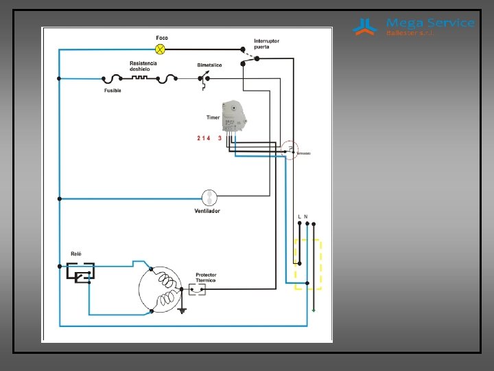 El timer es un dispositivo electromecánico que cuenta con un pequeño motor eléctrico que gira y marca en una gran parte del recorrido un ciclo que dura entre 6 y 8 horas dependiendo del timer y un pequeño periodo de 15 a 30 minutos que se utiliza para el defrost. POSEE 4 TERMINALES • LINEA • NEUTRO • COMPRESOR • RESISTENCIA