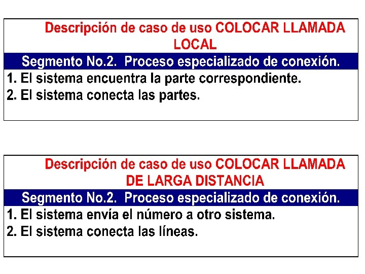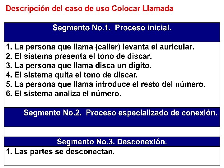 Colocar Llamada de Larga Distancia 1. La persona (caller) levanta el auricular 2. El sistema presenta el tono de discar 3. La persona disca un dígito 4. El sistema quita el tono de discar 5. La persona introduce el resto del número 6. El sistema analiza el número 7. El sistema envía el número a otro sistema 8. El sistema conecta las líneas 9. Las partes se desconectan