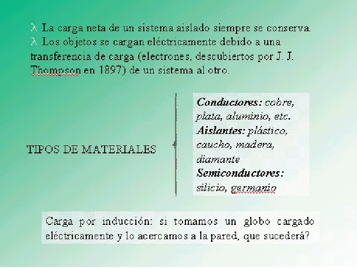 Materiales conductores y aislantes Ø Cuando un cuerpo neutro es electrizado, sus cargas eléctricas, bajo la acción de las fuerzas correspondientes, se redistribuyen hasta alcanzar una situación de equilibrio. Ø Conductores son los materiales que llevan la electricidad y la dejan pasar por ellos. Ø Aislantes al contrario son los materiales que no dejan pasar la electricidad y aíslan la electricidad.
