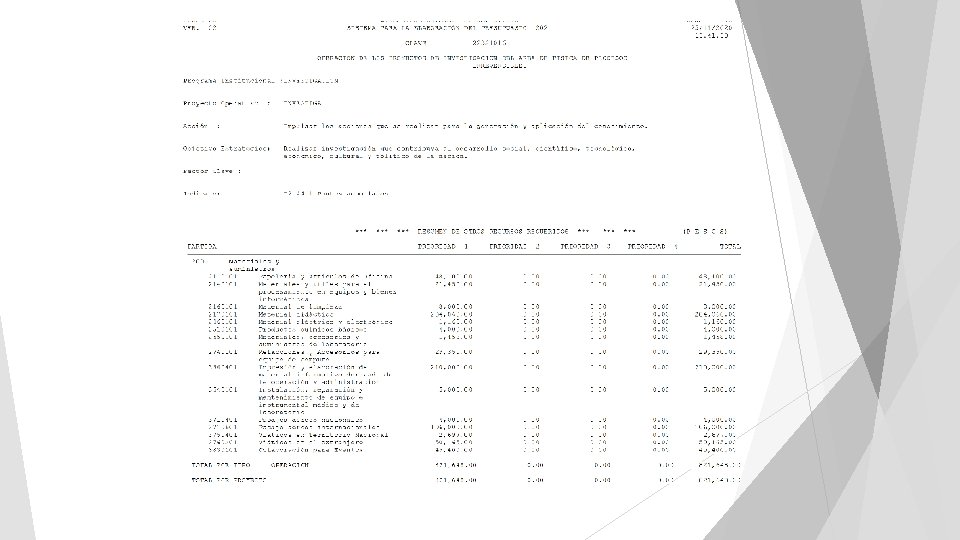 Aspectos operativos • • Un proyecto presupuestal contiene: • Objetivos generales y particulares • Justificación • Metas • Responsable y participantes • Presupuesto a nivel partida de operación (papelería, publicaciones, reactivos, etc. ) y/o inversión (equipo, bienes muebles, etc. ) También se dan de alta los proyectos de investigación vigentes