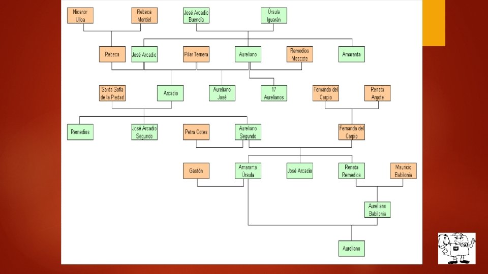 PERSONAJES: Primera generación José Arcadio Buendía, Úrsula Iguarán. Segunda generación José Arcadio Buendia, Coronel Aureliano Buendía, Amaranta, Rebeca. Tercera generación Arcadio, Aureliano José, Santa Sofía de la Piedad, 17 "Aurelianos". Cuarta generación Remedios la bella, José Arcadio Segundo, Aureliano Segundo. Quinta generación Renata Remedios (Meme), José Arcadio, Amaranta Úrsula. Sexta generación Aureliano Babilonia. Séptima generación Aureliano (el nombre que elige su madre es Rodrigo, pero no llega a usar ninguno de los dos).