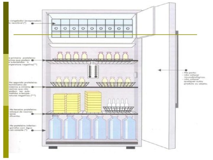 Arrumação da Geladeira • Na 1ª prateleira devem ser armazenadas as vacinas que podem ser submetidas à temperatura negativas (APO, TV, DV, FA). TERMÔMETRO • Na 2ª prateleira armazenar os imunobiológicos que não podem ser mantidos à temperaturas negativas (d. T, TT, HEP B, HIB, Anti - Raiva, BCG, Pneumococo, Pólio inativa. Ainda, no centro, colocar o termômetro de máxima e mínima na posição vertical. Saúde Coletiva