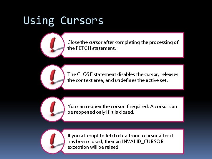 Fetching Data from the Cursor DECLARE CURSOR book_cursor IS SELECT ISBN, TITLE FROM books WHERE TITLE like ‘C%’; v_ISBN books. ISBN%TYPE; v_TITLE books. TITLE%TYPE; BEGIN OPEN book_cursor; LOOP FETCH book_cursor INTO v_ISBN, v_TITLE; EXIT WHEN book_cursor%NOTFOUND; DBMS_OUTPUT. PUT_LINE( v_ISBN ||' '||v_TITLE); END LOOP; . . . END;