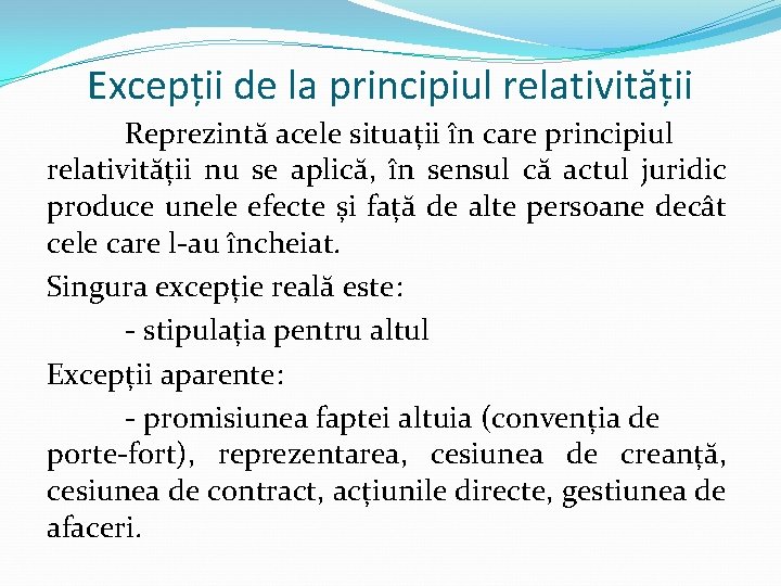 Excepții de la principiul relativității Reprezintă acele situații în care principiul relativității nu se aplică, în sensul că actul juridic produce unele efecte și față de alte persoane decât cele care l-au încheiat. Singura excepție reală este: - stipulația pentru altul Excepții aparente: - promisiunea faptei altuia (convenția de porte-fort), reprezentarea, cesiunea de creanță, cesiunea de contract, acțiunile directe, gestiunea de afaceri.