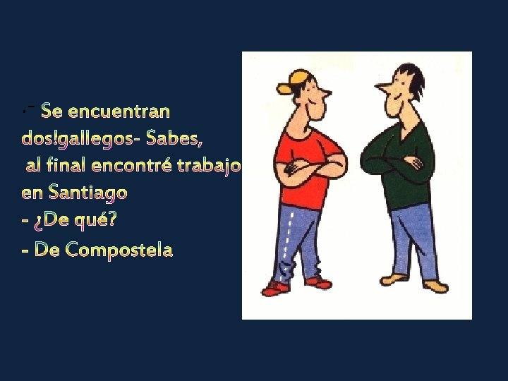 Dos gallegos de conversación - Anoche ligué con una tía buenísima. ¡qué piernas!, ¡qué pechos!, ¡qué trasero! - ¿Y de cara? - Ah, eso si, ¡carísima!.