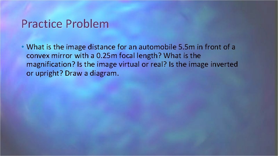 Practice Problem • What is the image distance for an automobile 5. 5 m in front of a convex mirror with a 0. 25 m focal length? What is the magnification? Is the image virtual or real? Is the image inverted or upright? Draw a diagram.