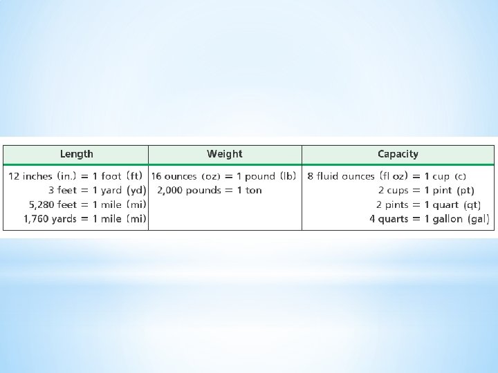 You can use the following benchmarks to help you understand fluid ounces, tons, and other customary units of measure. Customary Unit Length Weight Capacity Inch (in. ) Length of a small paper clip Foot (ft) Length of a standard sheet of paper Mile (mi) Length of 4 laps around a track Ounce (oz) Weight of a slice of bread Pound (lb) Weight of 3 apples Ton Weight of a buffalo Fluid ounce (fl oz) Amount of water in 2 tablespoons Cup (c) Gallon (gal) Capacity of a standard measuring cup Capacity of a large milk jug
