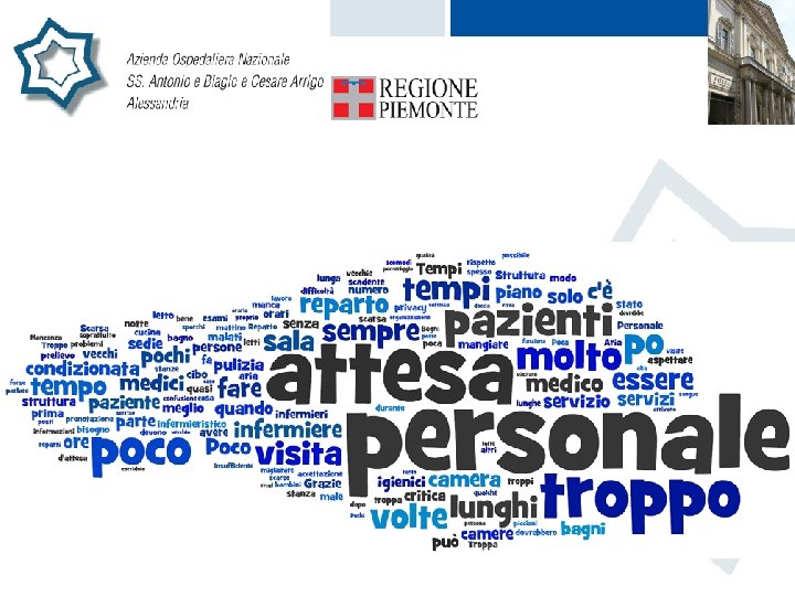 Risultati • il 37, 28% ha espresso critiche riguardanti l’ORGANIZZAZIONE delle attività di reparto e più frequentemente rispetto a: – Percezione di carenza di personale (circa 30%) – Tempi morti nelle varie fasi del processo/orari di visita non rispettati – Percorsi non snelli