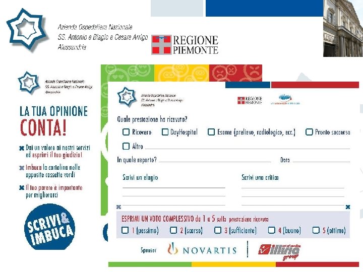Si tratta di una metodologia diffusa nel mondo anglosassone, che permette a chi conduce l’indagine di ottenere una buona qualità dell’informazione. Infatti, grazie alla possibilità di esprimersi in modo libero e andando oltre la logica del questionario, il paziente può manifestare il proprio punto di vista con informazioni puntuali che hanno contraddistinto la sua esperienza in ospedale sulla prestazione ricevuta. Per avere poi un giudizio di sintesi sul servizio, la cartolina contiene una scala per esprimere un voto complessivo sulla prestazione ricevuta a livello globale: dal punto di vista clinico, alberghiero, amministrativo. Questa scala rappresenta anche uno strumento per confrontare tra loro i risultati delle cartoline e provare a fare ipotetici raffronti con l’indagine dello scorso anno.