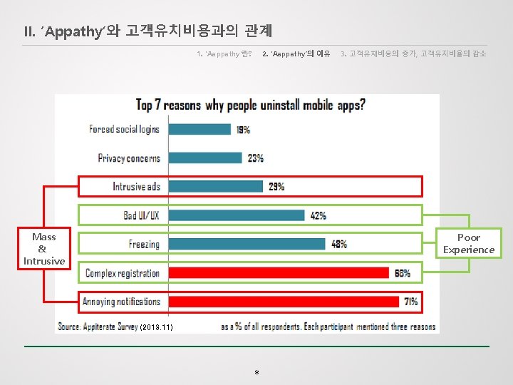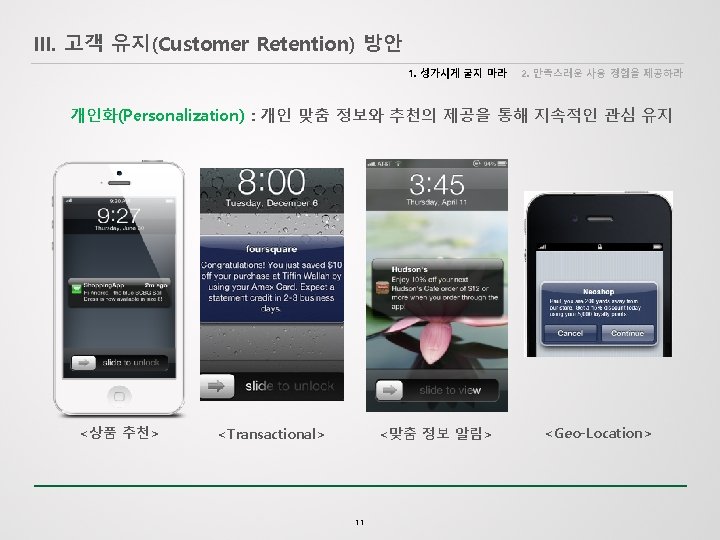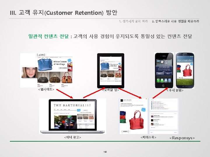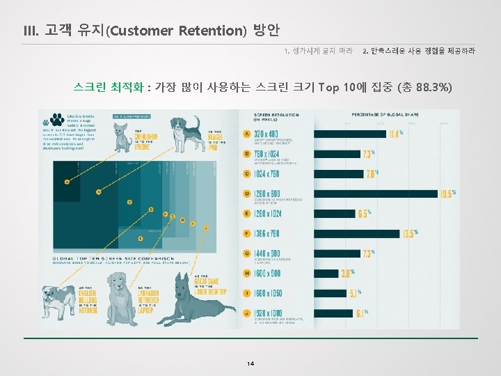 III. 고객 유지(Customer Retention) 방안 1. 성가시게 굴지 마라 2. 만족스러운 사용 경험을 제공하라 마케팅 프로그램 다변화 : 5가지 마케팅 프로그램으로 구분함 Welcome Program: Introduce a new subscriber or customer to the brand, build trust, help inform and drive the subscriber toward a first purchase or related conversion event. Abandon Program: Send offers to customers who have abandoned the purchase of a product or the completion of a form. Effectively recapture lost revenue by motivating customers to complete a process. Post-Purchase Program: Engage with a customer post-purchase to build upon the relationship and gain “earned media” that can drive referral revenue and facilitate word-of-mouth marketing. Winback Program: Re-engage customers who have not visited your site or made a purchase within a certain timeframe. By increasing engagement with less active segments, you can improve both revenue and deliverability. Event Countdown Program: Send a string of informational messages and targeted offers to customers who have purchased or registered for an upcoming event, driving attendance while building value and trust with customers. <Responsys> 13