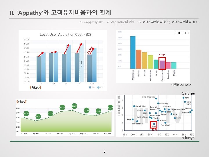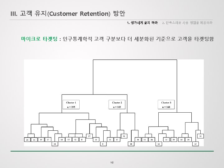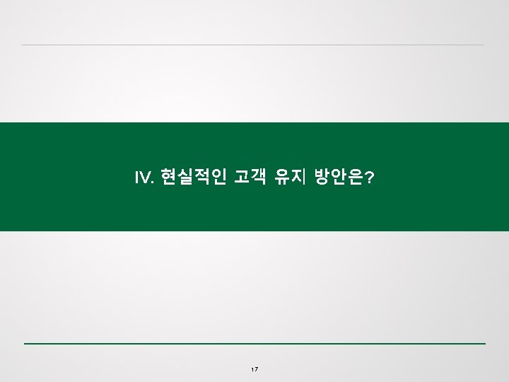 IV. 현실적인 고객 유지 방안은? 1. Small Data에 집중 2. 군집 분석의 적용 3. A/B 테스트 적용 Small Data : 기존에 관리되고 있는 데이터 중 의미있는 데이터에 대한 정의 및 활용 Small data connects people with timely, meaningful insights (derived from big data and/or “local” sources), organized and packaged – often visually – to be accessible, understandable, and actionable for everyday tasks. (스몰 데이터는 시기 적절하게, 의 미있는 인사이트를 제공하면서, 체계화되고, 잘 짜여져 담당자과 연결된다. 접근이 쉽고, 이해가 쉬우며, 모든 업무에서 바로 활용되기 위해…) - Paul Greenberg ‘ 10 Reasons 2014 will be the Year of Small Data’ 18