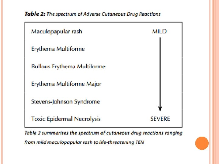 CLASSIFICATION OF CADR Severe CADR Non-Severe CADR ØErythema Multiforme (EM) ØStevens-Johnson syndrome (SJS) ØToxic Epidermal Necrolysis (TEN) Ø‘Rash’ covering greater than or equal to 50% of the body surface area (BSA) Ø‘Rash’ covering 10 to 40% of the BSA ØCADR with non-life-threatening sytemic synptoms