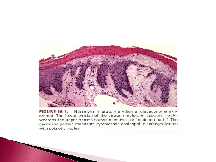 Necrolytic Migratory Erythema (Glucagonoma Syndrome) � is most commonly seen in association with a glucagonsecreting alpha cell tumor of the pancreas. � Surgical extirpation of the neoplasm may result in resolution of the eruption, as may amino acid and fatty acid infusion.