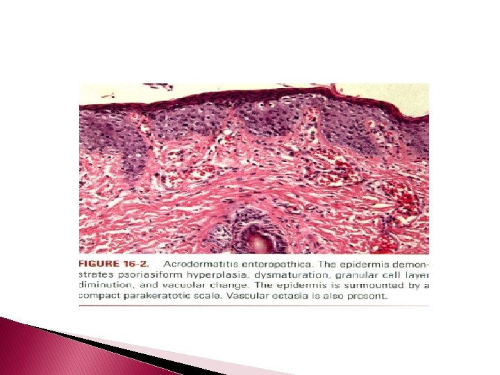 Histopathology � The upper part of the epidermis shows pallor due to intracellular edema and is surmounted by a confluent, thick, parakeratotic scale that may contain neutrophils. � There is granular cell layer diminution and focal dyskeratosis. � As with necrolytic migratory erythema, there may be architectural disarray and dismaturation. Subcorneal vesicles may be present. � The epidermis manifests variable psoriasiform hyperplasia and atrophy and, in a few instances, acantholysis.