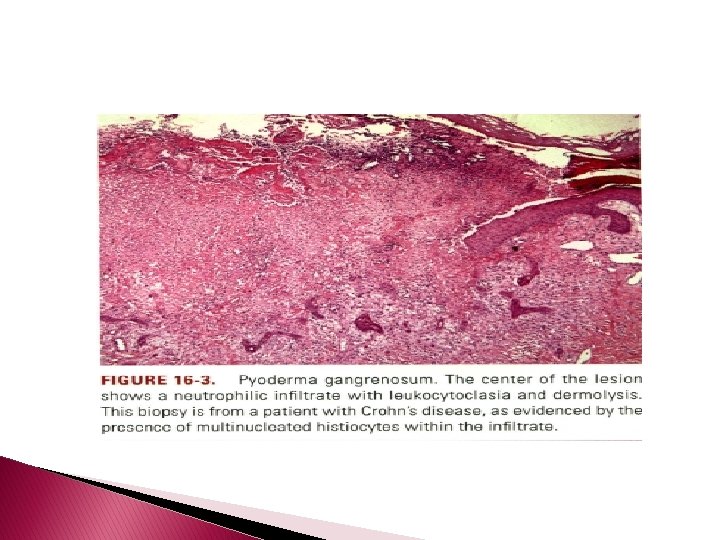 � In some cases a necrotizing pustular follicular reaction may be the central nidus of the lesion, particularly in the vesicular pustular variant associated with ulcerative colitis or shows a neutrophilic infiltrate with leukocytoclasia and dermolysis. � In the superficial granulomatous variant, florid pseudoepitheliomatous hyperplasia may be observed along with the intraepithelial and superficial dermal suppurative granulomatous inflammation with admixed plasma cells and eosinophils. � Cases of pyoderma gangrenosum associated with Crohn's disease may have areas of granulomatous inflammation.