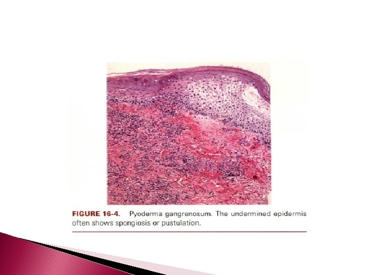 Histopathology � Vesiculopustular pyoderma gangrenosum is characterized by a necrolyric subepithelial blister in which massive papillary edema is accompanied by sheets of neutrophils within the blister cavity and prominent leukocytoclasia often centered around follicles. � Peripheral to the areas of neutrophilia, angiocentric mononuclear-cell infiltrates with minimal accompanying vascular injury are observed