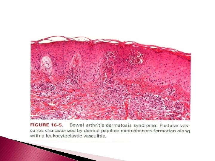 Histopathology � Characteristically, there is a perivascular Lymphocytic infiltrate with a peripheral cuff of disintegrating neutrophils, erythrocyte extravasation, & absent or minimal fibrin deposition consistent with a Sweet'slike vascular reaction; leukocytoclastic vasculitis occurs less often. � Papillary dermal edema may be striking and may lead to subepidermal vesiculation. � Epidermal pustulation, variable epithelial necrosis, & massive superficial dermal neutrophilia complete the picture & define pustular vasculitis.