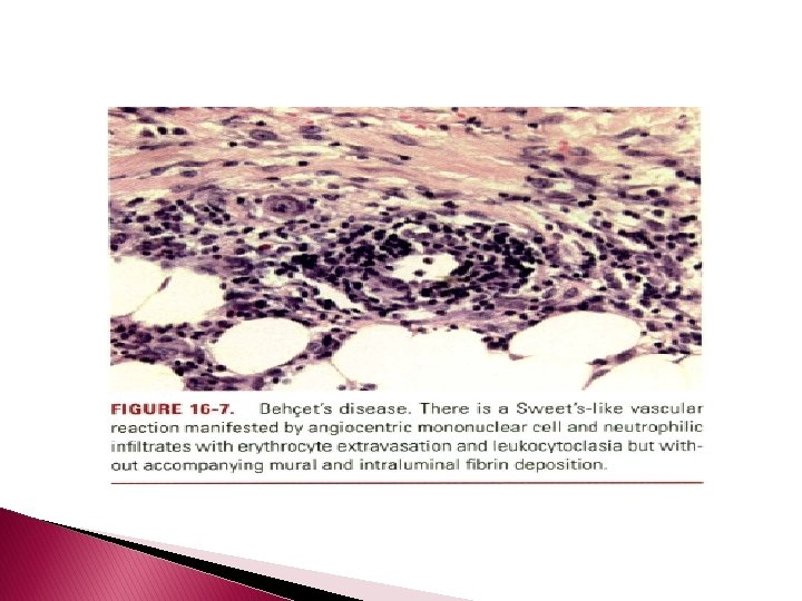 � inflammation of the dermis and/or panniculus may occur with or without the afore mentioned vascular changes. � The histiocytes infiltrating the panniculus may manifest phagocytosis of cellular debris. � Suppurative or mixed suppurative and granulomatous folliculitis with or without vasculitis characterizes the acneiform lesions. � Acral purpuric papulonodular lesions show a lymphocytic interface dermatitis with lymphocytic exocytosis, dyskeratosis, and a perivascular lymphocytic infiltrate, recapitulating the mucosal histopathology.